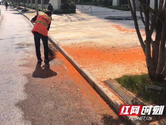 接到投诉,工作人员前往现场处理满地桂花。